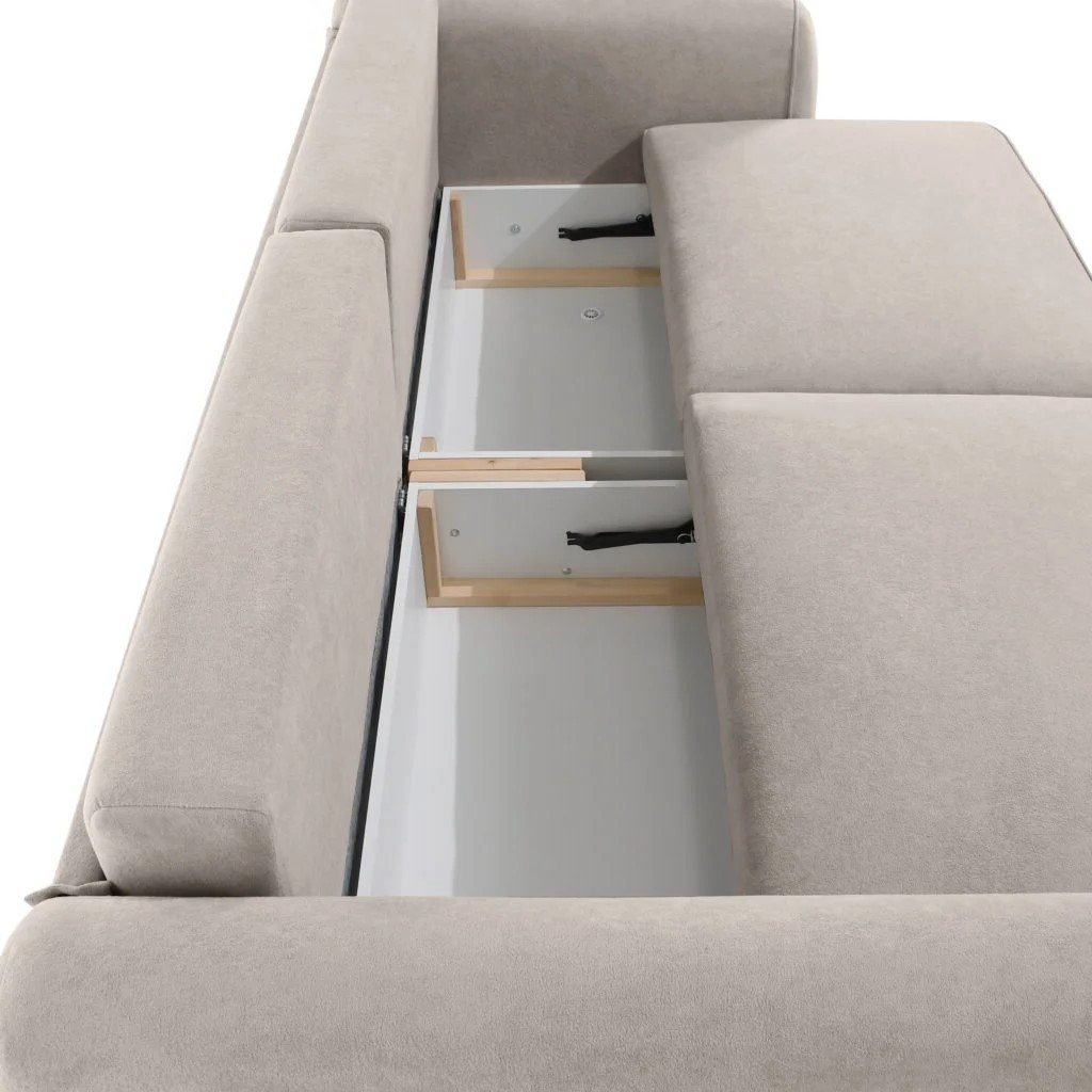 A kanapé egyszerűen nyitható, így gyorsan kényelmes fekhellyé alakítható. A beépített ágyneműtartó extra tárolóhelyet biztosít, amely segít rendben tartani az otthont – ideális takarók, párnák vagy ágynemű számára. Kényelmes ülő- és fekvőfelülete hosszú távon is komfortos használatot nyújt.