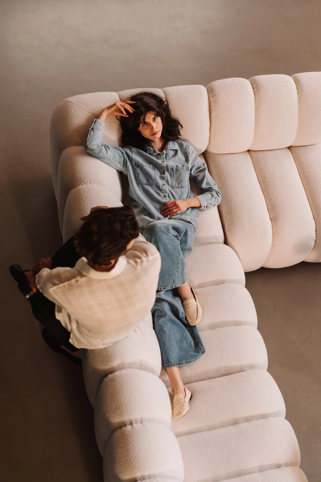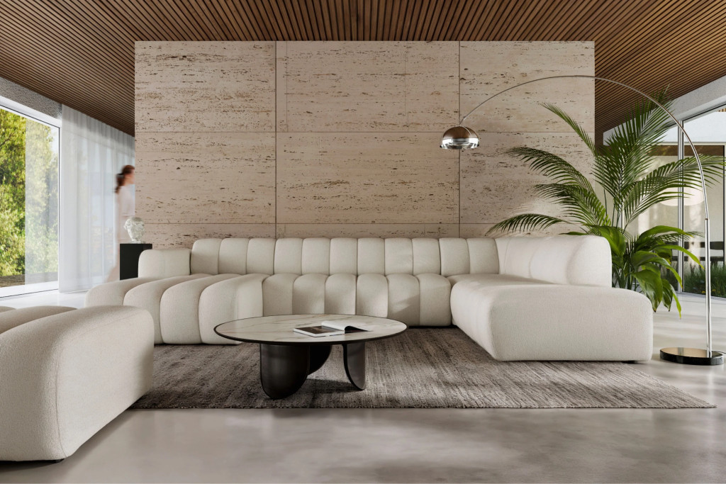 A Bummel III sarokkanapé modern formavilágával és minimalista esztétikájával azonnal magára vonja a figyelmet. Lágy, lekerekített vonalai és a mély, függőleges varrással kialakított párnaszerű szegmensek rendkívül otthonos és luxus megjelenést kölcsönöznek a bútornak. A széles karfák és az egységes, markáns forma tökéletesen illeszkednek a jelenlegi lakberendezési trendekhez – a modern soft stílustól a scandi-bohón át egészen a japandi irányzatig.