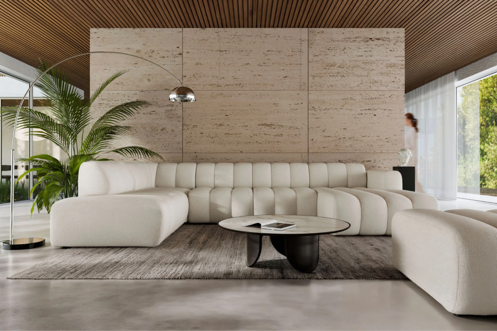 A Bummel III sarokkanapé modern formavilágával és minimalista esztétikájával azonnal magára vonja a figyelmet. Lágy, lekerekített vonalai és a mély, függőleges varrással kialakított párnaszerű szegmensek rendkívül otthonos és luxus megjelenést kölcsönöznek a bútornak. A széles karfák és az egységes, markáns forma tökéletesen illeszkednek a jelenlegi lakberendezési trendekhez – a modern soft stílustól a scandi-bohón át egészen a japandi irányzatig.