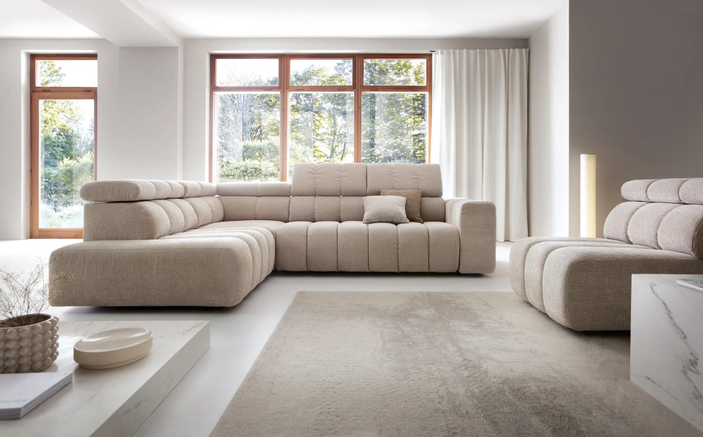Az L alakú kialakítás bőséges ülőhelyet biztosít, miközben modern megjelenésével harmonikusan illeszkedik a legtöbb lakberendezési stílushoz.
